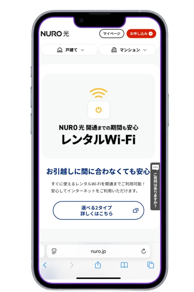 お申し込み後、最短4日程度で自宅に届きます。 開通工事が完了するまでの最大2ヶ月間、月額500円(初期費用別途2,200円)という格安料金で利用できるため、「ネット環境がなくて仕事や動画視聴ができない」という期間を最小限に抑えられます。すぐにネットが必要な方は、NURO光の申し込みと同時にレンタルWi-Fiも申し込むことをおすすめします。