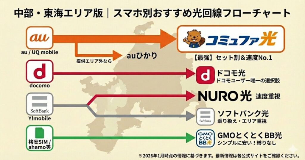 この記事では、中部エリアの主要な光回線を比較し、あなたのスマホキャリアにおいて「最も得する選択肢」を端的に解説します。